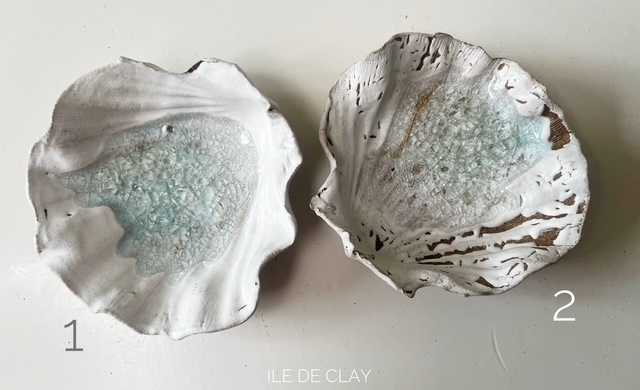 Deze bijzondere keramieken schelpen zijn geïnspireerd op de vorm van de klassieke St. Jacobsschelp. Ze zijn gemaakt van een prachtige spikkelklei en afgewerkt met diverse glazuren in zachte tinten: mat wit, bruin met blauw en wit, en verschillende groentinten.