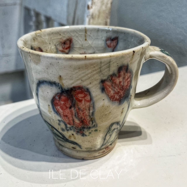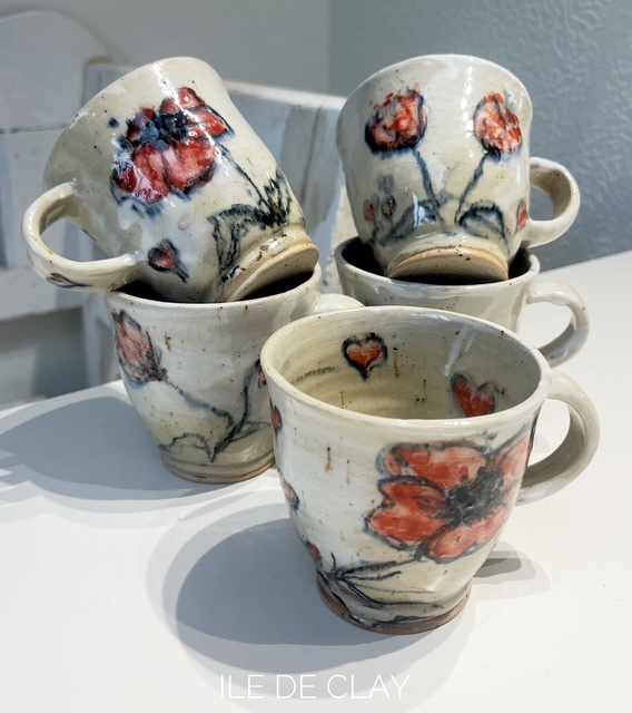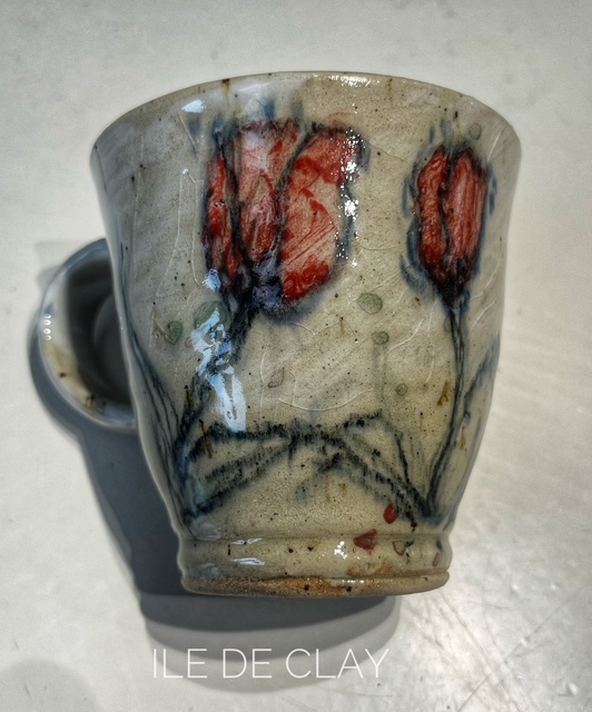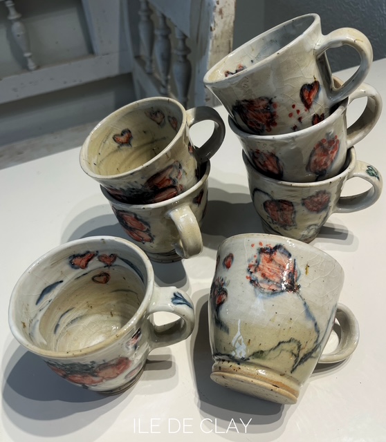 Zijn het geen schatjes, deze kopjes zijn gewoon lief en leuk. Met de hand gedraaid van spikkelklei en voorzien van een dun laagje porseleinslib. Daarover heb ik mijn lievelingsbloemen geschilderd, tulpen en klaprozen. Ik hou er van en wordt er vrolijk van.