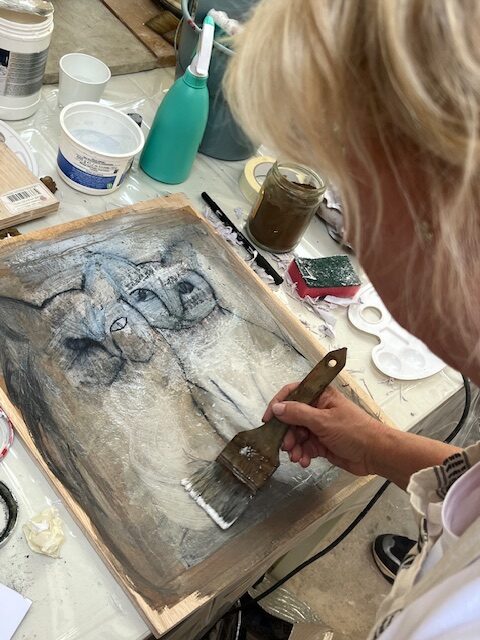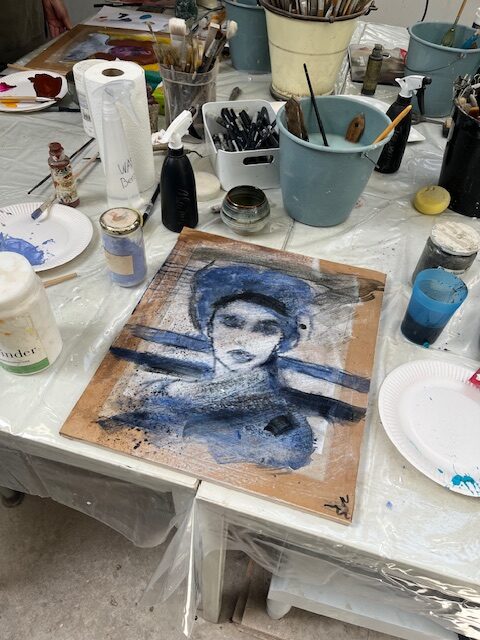 Een dag even iets helemaal anders. Een dag experimenteren met diverse verfsoorten (olie, acryl, gouache) pigmenten (waaronder gemalen Beemsterklei) krijt, stiften, papier en image transfers. En veel water, bindmiddelen, lijm, terpentine, alcohol. Lekker spetteren en experimenteren.